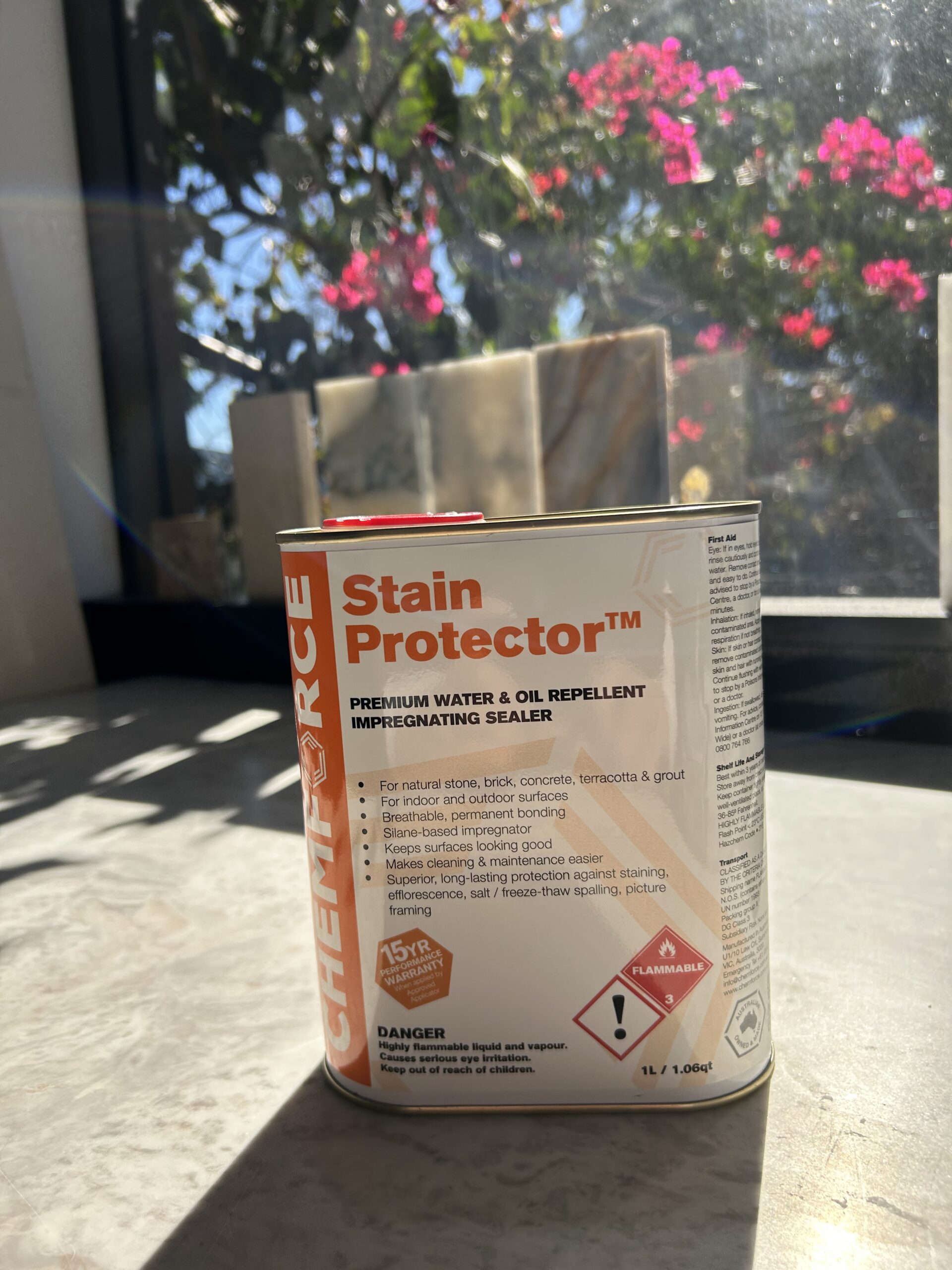 Stone & Tile Studio recommends Chemforce Stain Protector™ for most porous natural stone and outdoor pavers due to its superior water and oil repellence, UV and chemical resistance, and breathability (use Fortifier Plus™ for salt-water pool surrounds).
